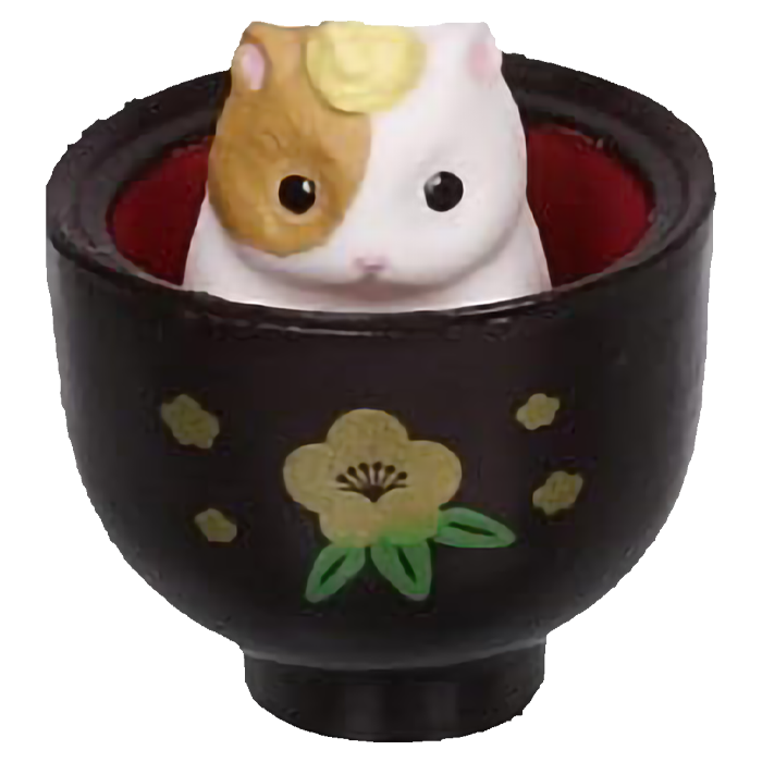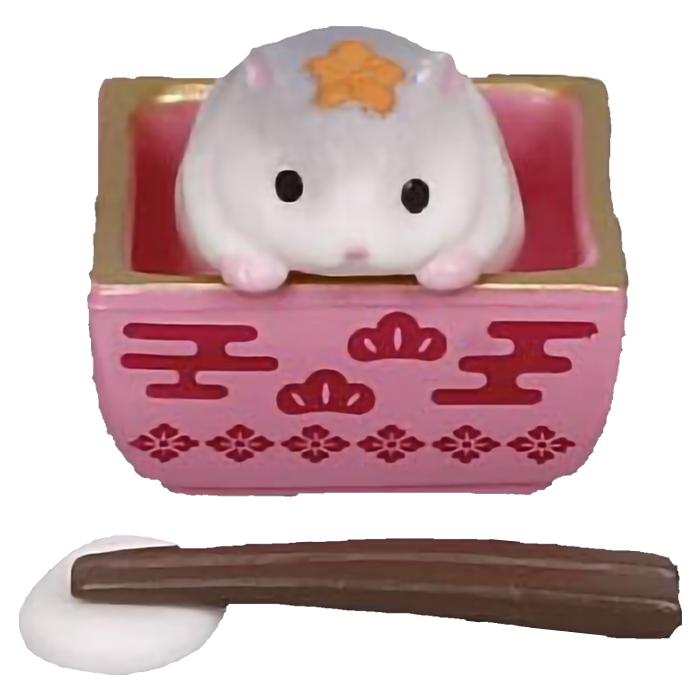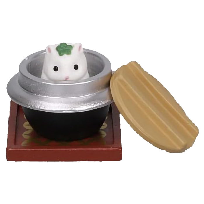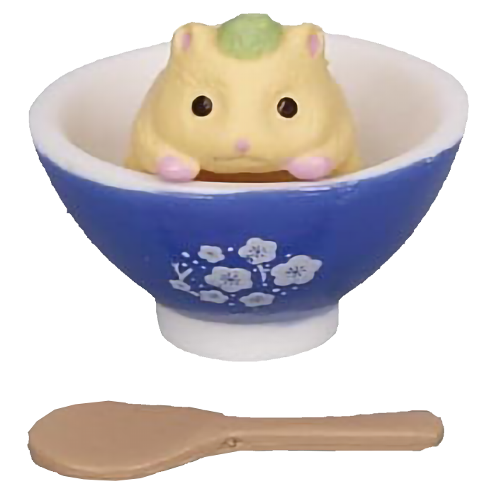 n questa serie di gashapon da collezione, ogni criceto e' protagonista di un piatto differente. Troverai il criceto bianco che riposa serenamente in una ciotola di riso, o il criceto pezzato che sbuca con curiosita' da un set per il te' o una zuppa fumante. La cura nel design trasforma ogni pezzetto di plastica in un'opera d'arte in miniatura, dove la texture del "pelo" contrasta con la finitura lucida delle stoviglie in stile lacca giapponese.